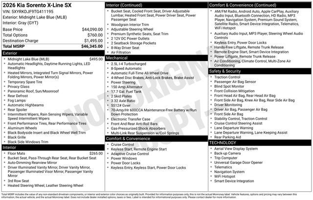 X-Line SX AWD 8 Speed Dual Clutch 2.5L I4 DGI Turbocharged DOHC 16V LEV3-SULEV30 281hp Price includes: $2500 - KFA Dealer Choice Program: $2500 discount and 5.25% APR for 36 months. $30.08 per $1000 financed. Available to well qualified buyers who finance through Kia Finance America. 506. Exp. 02/02/2026
