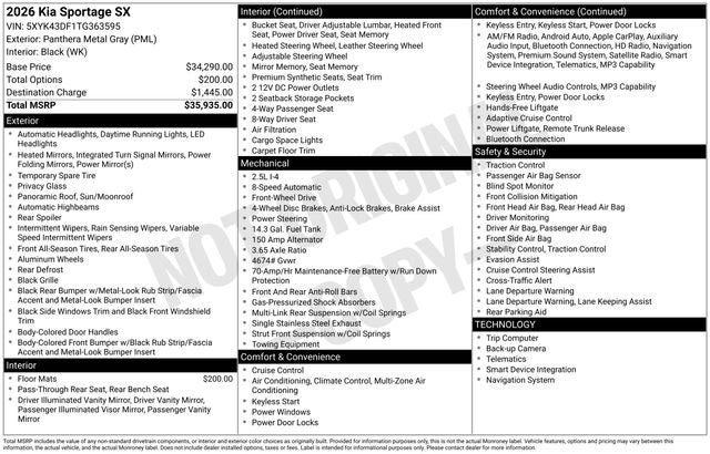 Comes with a Lifetime Powertrain Warranty at no extra charge on qualifying new vehicles. Coverage that lasts as long as you own the vehicle with no mileage limits. See dealer for full details and exclusions. Price includes: $1500 - KFA Dealer Choice Program: $1500 discount and 5.25% APR for 36 months. $30.08 per $1000 financed. Available to well qualified buyers who finance through Kia Finance America. 506. Exp. 01/02/2026