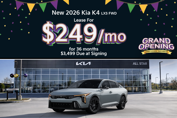 *Ex: 2026 Kia K4 LXS FWD. VIN: 3KPFT4DE7TE258395. MSRP: $26,585. Lease for $249 per month for 36 months with approved credit through Kia Finance America. $3,499 due at signing. Plus monthly taxes. 10,000 miles per year. Not all buyers will qualify. 13 available in stock at this price. Advertised Price EXCLUDES all optional dealer offered items, accessories, or product addendums optionally selected by the purchaser, applicable official taxes and fees, and a $436 documentary fee. See dealer for details. Offer Expires 3/31/2026.