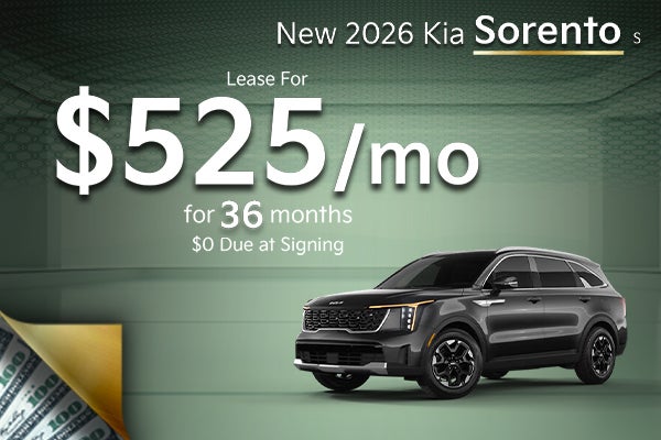 *Ex: 2026 Kia Sorento S. VIN: VIN: 5XYRL4JC7TG448779. MSRP: $38,515. Lease for $525 per month for 36 months with approved credit through Kia Finance America. $0 due at signing. Plus monthly taxes. 12,000 miles per year. No security deposit required. Not all buyers will qualify. 23 available in stock at this price. Advertised Price EXCLUDES all optional dealer offered items, accessories, or product addendums optionally selected by the purchaser, applicable official taxes and fees, and a $436 documentary fee. See dealer for details. Offer Expires 4/30/2026.