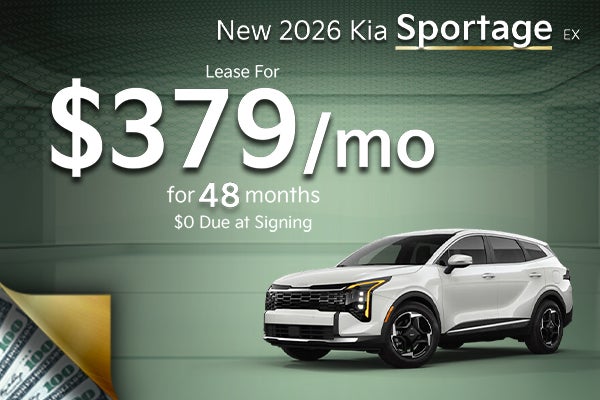 *Ex: 2026 Kia Sportage EX VIN: VIN: 5XYK33DF2TG410698. MSRP: $33,845. Lease for $379 per month for 48 months with approved credit through Kia Finance America. $0 due at signing. Plus monthly taxes. 12,000 miles per year. No security deposit required. Not all buyers will qualify. 11 available in stock at this price. Advertised Price EXCLUDES all optional dealer offered items, accessories, or product addendums optionally selected by the purchaser, applicable official taxes and fees, and a $436 documentary fee. See dealer for details. Offer Expires 4/30/2026.