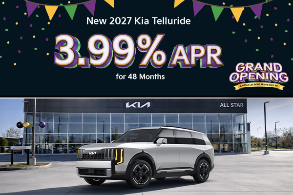 *3.99% APR for 48 months. $22.57 per month per every $1,000 borrowed at 3.99% APR for 48 months. With approved credit through Kia Finance America. Not all buyers will qualify. On select models. Several available in stock. Advertised Price EXCLUDES all optional dealer offered items, accessories, or product addendums optionally selected by the purchaser, applicable official taxes and fees, and a $436 documentary fee. See dealer for details. Offer Expires 3/31/2026.
