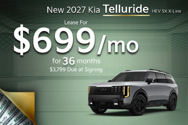 *Ex: 2027 Kia Telluride HEV SX X-Line. VIN: VIN: 5XYPDESA8VG006488. MSRP: $58,120. Lease for $5699 per month for 36 months with approved credit through Kia Finance America. $3,799 due at signing. Plus monthly taxes. 12,000 miles per year. No security deposit required. Not all buyers will qualify. 9 available in stock at this price. Advertised Price EXCLUDES all optional dealer offered items, accessories, or product addendums optionally selected by the purchaser, applicable official taxes and fees, and a $436 documentary fee. See dealer for details. Offer Expires 4/30/2026.