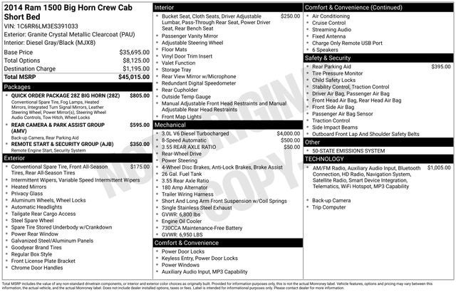 Granite Crystal Metallic Clearcoat 2014 Ram 1500 Big Horn RWD 8-Speed Automatic EcoDiesel 3.0L V6 WE DELIVER ANYWHERE, 1 Yr. Trial (Registration Required), 1-Yr SIRIUSXM Traffic Service, 1-Yr SIRIUSXM Travel Link Service, 115V Auxiliary Power Outlet, 17 x 7 Aluminum Wheels, 20 x 9 Polished/Painted Aluminum Wheels, 4-Wheel Disc Brakes, 40/20/40 Split Bench Seat, 5.0 Touchscreen Display, 6 Speakers, ABS brakes, Air Conditioning, Alloy wheels, AM/FM radio, Bighorn Badge, Black Exterior Mirrors, Brake assist, Bright/Bright Billets Grille, Bumpers: chrome, Center Hub, Charge Only Remote USB Port, Class IV Receiver Hitch, Cloth 40/20/40 Bench Seat, Compass, Delay-off headlights, Driver door bin, Dual front impact airbags, Dual front side impact airbags, Electronic Stability Control, Exterior Mirrors Courtesy Lamps, Exterior Mirrors w/Heating Element, Exterior Mirrors w/Supplemental Signals, Fog Lamps, Folding Flat Load Floor Storage, For Details Go To DriveUconnect.com, Front anti-roll bar, Front Armrest w/3 Cupholders, Front Center Armrest w/Storage, Front Center Seat Cushion Storage, Front reading lights, Front wheel independent suspension, Fully automatic headlights, GPS Navigation, HD Radio, Heated door mirrors, Illuminated entry, Integrated Voice Command w/Bluetooth®, Leather Wrapped Steering Wheel, Low tire pressure warning, Media Hub (USB, AUX), Occupant sensing airbag, Outside temperature display, Overhead airbag, Overhead console, Panic alarm, ParkSense Front/Rear Park Assist System, ParkView Rear Back-Up Camera, Passenger door bin, Passenger vanity mirror, Power 10-Way Driver Seat, Power Black Trailer Tow Mirrors, Power door mirrors, Power Lumbar Adjust, Power steering, Power windows, Premium Cloth 40/20/40 Bench Seat, Quick Order Package 28Z Big Horn, Radio data system, Radio: Uconnect 5.0 AM/FM/BT, Radio: Uconnect 8.4AN AM/FM/SXM/HD/BT/NAV, Rear 60/40 Split Folding Seat, Rear anti-roll bar, Rear Camera & Park Assist Group, Rear seat center armrest, Rear step bumper, Rear View Mirror w/Microphone, Remote keyless entry, Remote SD Card Slot, Remote Start & Security Group, Remote Start System, Security Alarm, SIRIUSXM Traffic, SiriusXM Travel Link, Speed control, Steering Wheel Mounted Audio Controls, Storage Tray, Tachometer, Tilt steering wheel, Traction control, Trip computer, Uconnect Access 1 Year Trial, Uconnect Voice Command w/Bluetooth®, Variably intermittent wipers, Voltmeter, Wheels: 20 x 8 Aluminum Chrome Clad.