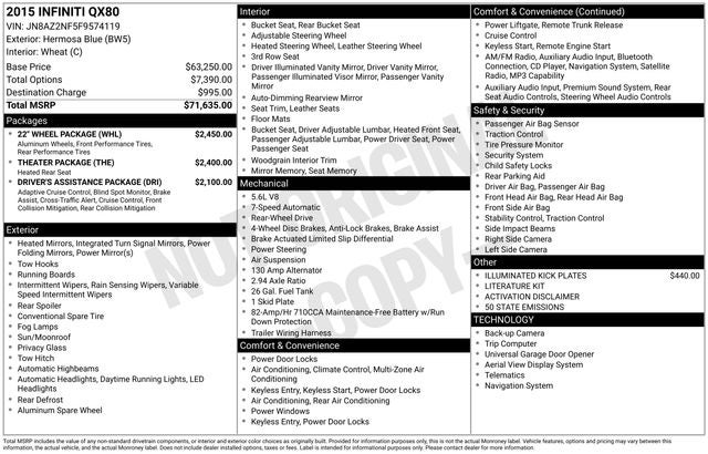 Discover the ultimate in luxury and capability with this 2015 INFINITI QX80 Base. Schedule a test drive today and experience the difference for yourself. We're confident that this exceptional vehicle will exceed your expectations and leave a lasting impression.