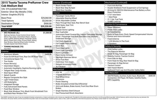 Clean CARFAX. Magnetic Gray Metallic 2015 Toyota Tacoma PreRunner V6 4.0L V6 EFI DOHC 24V 5-Speed Automatic RWD