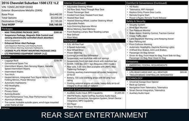 The Suburban LTZ also boasts a wealth of premium amenities, such as a leather-wrapped steering wheel, a power liftgate, and a rear-seat entertainment system with Blu-ray/DVD capabilities. The Max Trailering Package and Magnetic Ride Control Suspension Package further enhance the vehicle's capabilities, making it the perfect choice for both everyday driving and adventurous excursions.