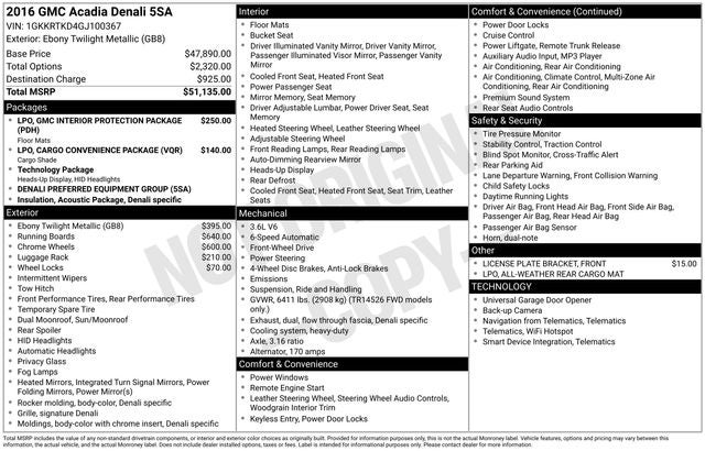 Ebony Twilight Metallic 2016 GMC Acadia Denali FWD 6-Speed Automatic 3.6L V6 SIDI 10 Speakers, 1st & 2nd Row All-Weather Floor Mats, 2-Position Memory For Driver's Seat Adjuster, 20 x 7.5 Aluminum Wheels, 3.16 Axle Ratio, 3rd Row All-Weather Floor Mats, 3rd row seats: split-bench, 4-Wheel Disc Brakes, 7-Passenger Seating (2-2-3 Seating Configuration), 8-Way Power Driver Seat w/Memory, 8-Way Power Passenger Seat Adjuster, ABS brakes, Air Conditioning, Alloy wheels, AM/FM radio: SiriusXM, Auto-dimming door mirrors, Auto-dimming Rear-View mirror, Automatic temperature control, Black Roof Rack Cross Bars, Body-Color Moldings w/Chrome Insert, Bodyside moldings, Bose Premium 10-Speaker Audio System, Brake assist, Bumpers: body-color, Cargo Area Shade Cover, Cargo Convenience Package, Cargo Net, CD player, Chromed Tubular Assist Steps (LPO), Compass, Delay-off headlights, Denali Specific Acoustic Insulation Package, Denali Specific Body-Color Rocker Molding, Denali Specific Bright Side Rails Luggage Rack, Denali Specific Dual Flow Through Fascia Exhaust, Denali Specific Front Fascia, Denali Specific Illuminated Sill Plate, Driver door bin, Driver vanity mirror, Dual front impact airbags, Dual front side impact airbags, Dual SkyScape 2-Panel Power Sunroof, Electronic Stability Control, Emergency communication system: OnStar Guidance, Exterior Parking Camera Rear, Forward Collision Alert & Lane Departure Warning, Four wheel independent suspension, Front anti-roll bar, Front Bucket Seats, Front Center Armrest w/Storage, Front dual zone A/C, Front fog lights, Front License Plate Bracket, Front reading lights, Fully automatic headlights, Garage door transmitter, GMC Interior Protection Package (LPO), Head-Up Display, Heads-Up Display, Heated & Cooled Front Seats, Heated door mirrors, Heated front seats, Heated Leather Wrapped Steering Wheel, Heated Power-Adjustable Outside Mirrors, Heated steering wheel, Heavy-Duty Cooling System, High-Intensity Discharge Headlights, High-Intensity Discharge Projector Low Beam Headlamps, Illuminated entry, Inside Rear-View Auto-Dimming Mirror, Leather Shift Knob, Leather steering wheel, Leather-Wrapped Steering Wheel w/Wood Trim, Low tire pressure warning, Memory seat, Navigation System, NavTraffic, Occupant sensing airbag, Outside temperature display, Overhead airbag, Overhead console, Panic alarm, Passenger door bin, Passenger vanity mirror, Perforated Leather-Appointed Seat Trim, Power door mirrors, Power driver seat, Power Liftgate, Power moonroof, Power passenger seat, Power Rear Liftgate Body, Power steering, Power Tilt & Telescopic Steering Column, Power windows, Power Windows w/Driver Express-Up & -Down, Preferred Equipment Group 5SA, Premium Carpeted Front 2nd & 3rd Row Floor Mats, Radio data system, Radio: Color Touch Navigation w/IntelliLink, Rear air conditioning, Rear All-Weather Cargo Mat (LPO), Rear anti-roll bar, Rear audio controls, Rear Audio System Controls, Rear Cargo Area Audio System Controls, Rear Parking Sensors, Rear reading lights, Rear window defroster, Rear window wiper, Remote keyless entry, Remote Vehicle Start, Roof rack: rails only, Security system, Side Blind Zone Alert & Rear Cross Traffic Alert, Speed control, Speed-sensing steering, Spoiler, Steering wheel memory, Steering Wheel Mounted Audio Controls, Steering wheel mounted audio controls, Tachometer, Technology Package, Telescoping steering wheel, Tilt steering wheel, Traction control, Trailer Hitch, Trailering Equipment, Tri-Zone Automatic Climate Control, Trip computer, Turn signal indicator mirrors, Universal Home Remote, Variable Effort Power Steering, Variably intermittent wipers, Ventilated front seats, Voltmeter, Wheel Locks, Wheels: 20 x 7.5 Chrome-Clad Aluminum (4).