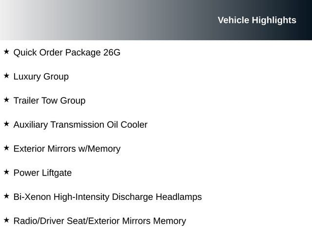 - Luxury Group: Includes ventilated front seats, bi-xenon HID headlamps, exterior mirrors with memory, power liftgate, and memory settings for the radio, driver's seat, and exterior mirrors.