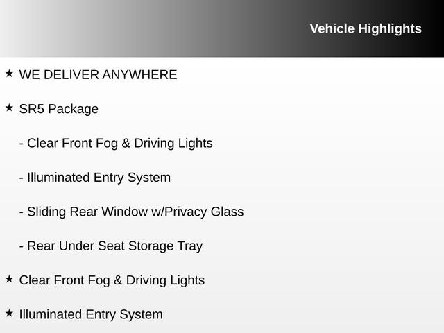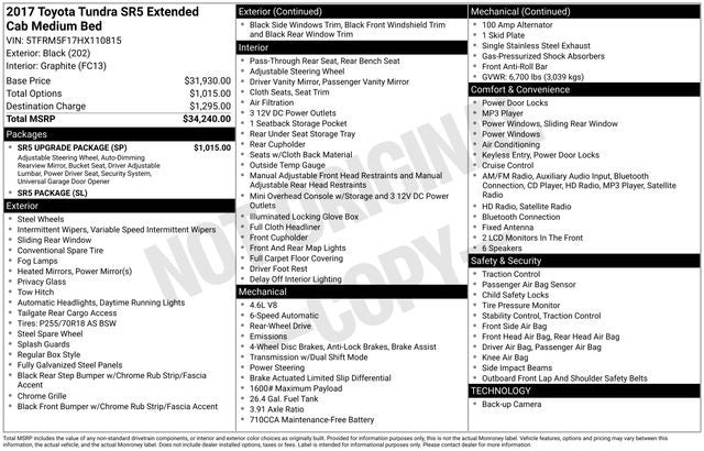 Black 2017 Toyota Tundra SR5 4.6L V8 RWD 6-Speed Automatic Electronic with Overdrive 4.6L V8 DOHC Dual VVT-i 32V WE DELIVER ANYWHERE, Graphite w/Fabric Seat Trim or Fabric Seat Trim w/TRD Off-Road Package, Clear Front Fog & Driving Lights, Illuminated Entry System, Rear Under Seat Storage Tray, Sliding Rear Window w/Privacy Glass, SR5 Package, 18 x 8J Styled Steel Wheels, 3-Passenger Front Bench Seat, 3.91 Axle Ratio, 4-Wheel Disc Brakes, 6 Speakers, ABS brakes, Air Conditioning, AM/FM radio: SiriusXM, Brake assist, CD player, Driver door bin, Driver vanity mirror, Dual front impact airbags, Dual front side impact airbags, Electronic Stability Control, Exterior Parking Camera Rear, Fabric Seat Trim, Front anti-roll bar, Front Center Armrest w/Storage, Front fog lights, Front reading lights, Front wheel independent suspension, Heated door mirrors, Illuminated entry, Knee airbag, Low tire pressure warning, Occupant sensing airbag, Outside temperature display, Overhead airbag, Overhead console, Panic alarm, Passenger door bin, Passenger vanity mirror, Power door mirrors, Power steering, Power windows, Radio: Entune Audio Display AM/FM/HD w/CD Player, Rear reading lights, Rear step bumper, Remote keyless entry, SIRIUSXM Satellite Radio, Speed control, Speed-sensing steering, Split folding rear seat, Tachometer, Tilt steering wheel, Traction control, Variably intermittent wipers, Voltmeter, Graphite w/Fabric Seat Trim or Fabric Seat Trim w/TRD Off-Road Package, Clear Front Fog & Driving Lights, Illuminated Entry System, Rear Under Seat Storage Tray, Sliding Rear Window w/Privacy Glass, SR5 Package.