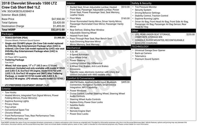 Black 2018 Chevrolet Silverado 1500 LTZ 1LZ 4WD 6-Speed Automatic Electronic with Overdrive EcoTec3 5.3L V8 6-Speed Automatic Electronic with Overdrive, 4WD, Cocoa/Dune Leather, Trailering Package, 110-Volt AC Power Outlet, 150 Amp Alternator, 3.42 Rear Axle Ratio, 4-Wheel Disc Brakes, 4.2 Diagonal Color Display Driver Info Center, 40/20/40 Front Split Bench Seat, 6 Speaker Audio System, 6 Speakers, ABS brakes, Air Conditioning, Alloy wheels, AM/FM radio: SiriusXM, Auto-dimming door mirrors, Auto-Dimming Inside Rear-View Mirror, Auto-dimming Rear-View mirror, Automatic temperature control, Auxiliary External Transmission Oil Cooler, Bluetooth® For Phone, Bodyside moldings, Bose Speaker System, Brake assist, CD player, Chevrolet Connected Access, Chevrolet w/4G LTE, Chrome Bodyside Moldings, Chrome Cap Power-Adjustable Heated Outside Mirrors, Chrome Door Handles, Chrome Mirror Caps, Color-Keyed Carpeting w/Rubberized Vinyl Floor Mats, Compass, Deep-Tinted Glass, Delay-off headlights, Driver & Front Passenger Illuminated Vanity Mirrors, Driver door bin, Driver vanity mirror, Dual front impact airbags, Dual front side impact airbags, Dual-Zone Automatic Climate Control, Electric Rear-Window Defogger, Electronic Stability Control, Exterior Parking Camera Rear, EZ Lift & Lower Tailgate, Floor Mounted Console, Front & Rear All-Weather Floor Mats, Front anti-roll bar, Front Center Armrest w/Storage, Front Chrome Bumper, Front dual zone A/C, Front fog lights, Front Frame-Mounted Black Recovery Hooks, Front Full Feature Power Reclining Bucket Seats, Front reading lights, Front wheel independent suspension, Fully automatic headlights, Garage door transmitter, HD Radio, Heated door mirrors, Heated Driver & Front Passenger Seats, Heated front seats, Heavy-Duty Rear Locking Differential, Illuminated entry, Leather Appointed Seat Trim, Leather Wrapped Steering Wheel w/Cruise Controls, LED Taillamps w/Signature, Low tire pressure warning, Manual Tilt/Telescoping Steering Column, Memory seat, Occupant sensing airbag, OnStar & Chevrolet Connected Services Capable, Outside temperature display, Overhead airbag, Overhead console, Panic alarm, Passenger door bin, Passenger vanity mirror, Power door mirrors, Power driver seat, Power passenger seat, Power Sliding Rear Window, Power steering, Power windows, Power Windows w/Driver Express Up, Premium audio system: Chevrolet MyLink, Radio data system, Radio: AM/FM 8 Diagonal Clr Touch Nav, Radio: AM/FM 8 Diagonal Color Touch Screen, Rear 60/40 Folding Bench Seat (Folds Up), Rear Chrome Bumper, Rear reading lights, Rear seat center armrest, Rear step bumper, Rear Under-Seat Composite Storage Bin (LPO), Rear Wheelhouse Liners, Rear window defroster, Remote Keyless Entry, Remote keyless entry, Remote Locking Tailgate, Remote Vehicle Starter System, Security system, Single Slot CD/MP3 Player, SiriusXM Satellite Radio, Speed control, Speed-sensing steering, Split folding rear seat, Spray-On Pickup Box Bed Liner, Steering Wheel Audio Controls, Steering wheel mounted audio controls, Tachometer, Telescoping steering wheel, Theft Deterrent System (Unauthorized Entry), Thin Profile LED Fog Lamps, Tilt steering wheel, Traction control, Trip computer, Turn signal indicator mirrors, Universal Home Remote, Variably intermittent wipers, Voltmeter, Wheels: 20 x 9 Chrome, Wireless Charging, 6-Speed Automatic Electronic with Overdrive, 4WD, Cocoa/Dune Leather, Trailering Package.