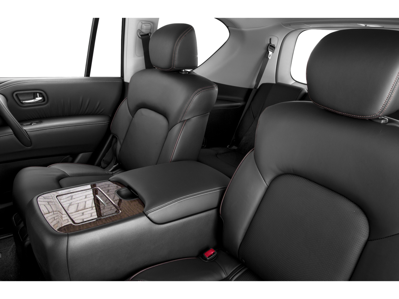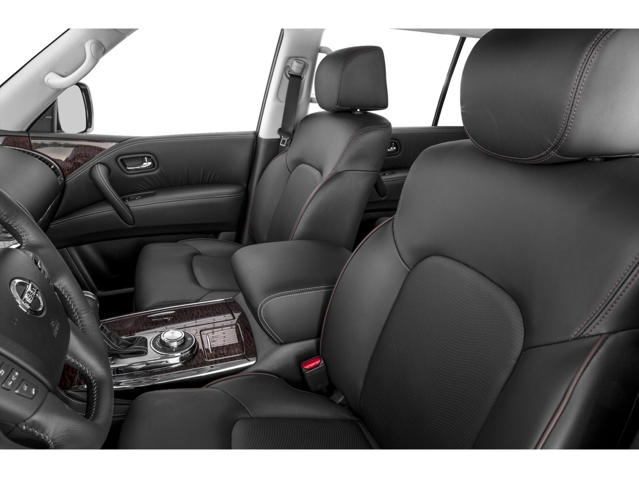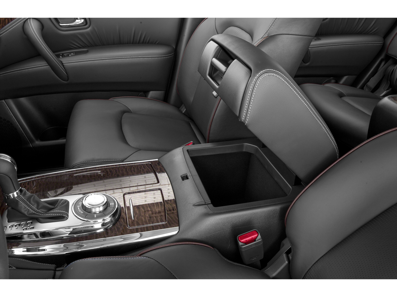 13 Speakers, 2.937 Axle Ratio, 2nd Row Captain's Chairs, 2nd Row Center Console w/ Padded Armrest, 3rd row seats: split-bench, 4-Wheel Disc Brakes, A/V remote, ABS brakes, Air Conditioning, Alloy wheels, AM/FM radio: SiriusXM, Anti-whiplash front head restraints, Auto tilt-away steering wheel, Auto-dimming door mirrors, Auto-dimming Rear-View mirror, Auto-leveling suspension, Automatic temperature control, Brake assist, Bumpers: body-color, Captain's Chairs Package, Carpeted Floor Mats w/ Captain Seat Package, CD player, Cross Bars, Delay-off headlights, Driver door bin, Driver vanity mirror, Dual front impact airbags, Dual front side impact airbags, Electronic Stability Control, Emergency communication system: NissanConnect Services, Four wheel independent suspension, Front anti-roll bar, Front Bucket Seats, Front Center Armrest, Front dual zone A/C, Front fog lights, Front reading lights, Fully automatic headlights, Garage door transmitter: HomeLink, Headphones, Heated & Cooled Front Bucket Seats w/Driver Memory, Heated door mirrors, HEATED FRONT SEATS, Heated rear seats, Heated steering wheel, Illuminated entry, Leather Shift Knob, Leather-Appointed Seat Trim, Low tire pressure warning, Memory seat, NAVIGATION, Occupant sensing airbag, Outside temperature display, Overhead airbag, Overhead console, Panic alarm, Passenger door bin, Passenger vanity mirror, Power door mirrors, Power driver seat, Power Liftgate, Power moonroof, Power passenger seat, Power steering, Power windows, Radio data system, Radio: AM/FM/SXM/CD/MP3/HD, Rain sensing wipers, Rear air conditioning, Rear anti-roll bar, Rear reading lights, Rear seat center armrest, Rear window defroster, Rear window wiper, Reclining 3rd row seat, Remote keyless entry, Roof rack: rails only, Security system, Speed control, Speed-sensing steering, Speed-Sensitive Wipers, Split folding rear seat, Spoiler, Steering wheel memory, Steering wheel mounted audio controls, Tachometer, Telescoping steering wheel, Tilt steering wheel, Traction control, Trip computer, Turn signal indicator mirrors, Variably intermittent wipers, Ventilated front seats, Voltmeter, Wheels: 20 Machine-Faced Chrome w/Tinted CC.