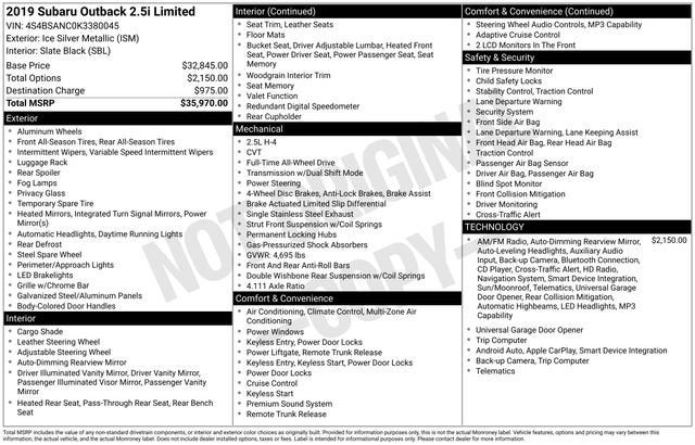 12 Speakers, 18 Alloy Wheels, 4-Wheel Disc Brakes, 4.111 Axle Ratio, ABS brakes, Air Conditioning, Alloy wheels, AM/FM radio: SiriusXM, Auto-Dimming Rear View Compass Mirror w/HomeLink, Auto-dimming Rear-View mirror, Automatic temperature control, Brake assist, Bumpers: body-color, CD player, Compass, Driver door bin, Driver vanity mirror, Dual front impact airbags, Dual front side impact airbags, Electronic Stability Control, Emergency communication system, Exterior Parking Camera Rear, Four wheel independent suspension, Front anti-roll bar, Front Bucket Seats, Front Center Armrest w/Storage, Front dual zone A/C, Front fog lights, Front reading lights, Fully automatic headlights, Garage door transmitter, harman/kardon Surround Sound Speaker System, harman/kardon® Speakers, Heated door mirrors, Heated Front Bucket Seats, Heated front seats, Heated rear seats, High Beam Assist (HBA), Illuminated entry, Leather Shift Knob, LED Steering Responsive Headlights, Low tire pressure warning, Memory seat, Moonroof & Navigation & HBA & RAB & LED SRH, Occupant sensing airbag, Outside temperature display, Overhead airbag, Overhead console, Panic alarm, Passenger door bin, Passenger vanity mirror, Perforated Leather-Trimmed Upholstery, Power door mirrors, Power driver seat, Power Liftgate, Power Moonroof Package, Power passenger seat, Power steering, Power windows, Radio: Subaru STARLINK 8.0 Multimedia Nav System, Radio: Subaru STARLINK 8.0 Multimedia Plus System, Rear anti-roll bar, Rear seat center armrest, Rear window defroster, Rear window wiper, Remote keyless entry, Reverse Automatic Braking (RAB), Roof rack, Security system, Smartphone Integration, Speed control, Speed-sensing steering, Split folding rear seat, Spoiler, STARLINK/Apple CarPlay/Android Auto, Steering wheel mounted audio controls, Steering Wheel Paddle Shift Control Switches, Tachometer, Telescoping steering wheel, Tilt steering wheel, Traction control, Trip computer, Turn signal indicator mirrors, Variably intermittent wipers, Vehicle Information Display.