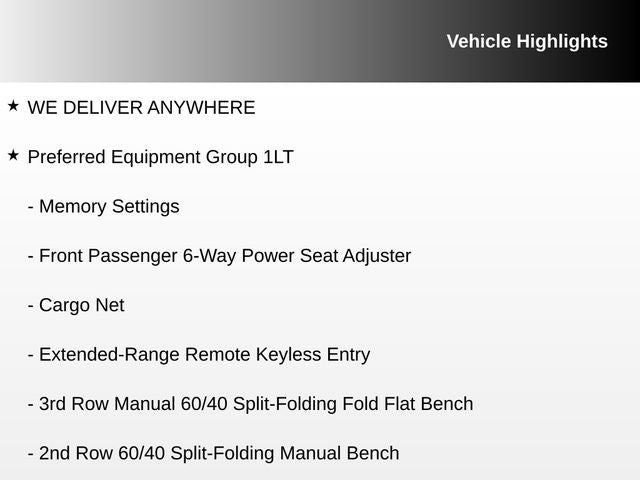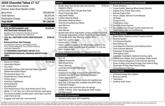 Satin Steel Metallic 2020 Chevrolet Tahoe LT RWD 6-Speed Automatic Electronic with Overdrive EcoTec3 5.3L V8 WE DELIVER ANYWHERE, Cocoa/Dune Leather, 1st & 2nd Row Color-Keyed Carpeted Floor Mats, 2nd Row 60/40 Split-Folding Manual Bench, 3rd Row Manual 60/40 Split-Folding Fold Flat Bench, 4-Wheel Antilock Disc Brakes w/Brake Assist, 5 12-Volt Auxiliary Power Outlets, All-Weather Floor Liner Package (LPO), Auto-Dimming Inside Rear-View Mirror, Automatic Emergency Braking, Black Assist Steps, Bose Premium 9-Speaker System, Cargo Net, Color-Keyed Carpeting Floor Covering, Driver Inboard & Front Passenger Airbags, Electronic Cruise Control w/Set & Resume Speed, Enhanced Driver Alert Package (Y86), Extended-Range Remote Keyless Entry, Floor Console, Forward Collision Alert, Front Passenger 6-Way Power Seat Adjuster, IntelliBeam Headlamps, Lane Keep Assist w/Lane Departure Warning, Leather-Wrapped Steering Wheel, Memory Settings, Power Liftgate, Power Sunroof, Power-Adjustable Accelerator & Brake Pedals, Preferred Equipment Group 1LT, Premium Smooth Ride Suspension Package, Radio: Chevrolet Infotainment AM/FM Stereo w/Nav, Rear Park Assist w/Audible Warning, Rear Seat Blu-Ray/DVD Entertainment System, Remote Vehicle Start, Roof-Mounted Luggage Rack Side Rails, SiriusXM Radio, Sun, Entertainment & Destinations Package, Universal Home Remote, 18 x 8.5 Aluminum Wheels, 2nd Row Manual Bucket Seats, 3.08 Rear Axle Ratio, 3rd row seats: split-bench, 4-Wheel Disc Brakes, 9 Speakers, ABS brakes, Adjustable pedals, Air Conditioning, Alloy wheels, AM/FM radio: SiriusXM, Apple CarPlay/Android Auto, Auto High-beam Headlights, Auto-dimming Rear-View mirror, Automatic temperature control, Bluetooth® for Phone, Brake assist, Bumpers: body-color, CD player, Compass, Delay-off headlights, Driver door bin, Driver vanity mirror, Dual front impact airbags, Dual front side impact airbags, Electronic Stability Control, Emergency communication system: OnStar and Chevrolet connected services capable, Exterior Parking Camera Rear, Front anti-roll bar, Front Bucket Seats, Front Center Armrest, Front dual zone A/C, Front Heated Reclining Bucket Seats, Front reading lights, Front wheel independent suspension, Fully automatic headlights, Garage door transmitter, HD Radio, Heated door mirrors, Heated front seats, Illuminated entry, Leather steering wheel, Leather-Appointed Seat Trim, Low tire pressure warning, Memory seat, Occupant sensing airbag, Outside temperature display, Overhead airbag, Overhead console, Panic alarm, Passenger door bin, Passenger vanity mirror, Pedal memory, Power door mirrors, Power driver seat, Power passenger seat, Power steering, Power windows, Premium audio system: Chevrolet MyLink, Radio: Chevrolet Infotainment AM/FM Stereo, Rain sensing wipers, Rear air conditioning, Rear anti-roll bar, Rear reading lights, Rear seat center armrest, Rear window defroster, Rear window wiper, Remote keyless entry, Security system, Single-Slot CD/MP3 Player, SiriusXM NavTraffic, Speed control, Speed-sensing steering, Split folding rear seat, Spoiler, Steering wheel mounted audio controls, Tachometer, Telescoping steering wheel, Tilt steering wheel, Traction control, Trip computer, Variably intermittent wipers, Voltmeter, Wheels: 20 x 9 Polished-Aluminum, Cocoa/Dune Leather, 1st & 2nd Row Color-Keyed Carpeted Floor Mats, 2nd Row 60/40 Split-Folding Manual Bench, 3rd Row Manual 60/40 Split-Folding Fold Flat Bench, 4-Wheel Antilock Disc Brakes w/Brake Assist, 5 12-Volt Auxiliary Power Outlets, All-Weather Floor Liner Package (LPO), Auto-Dimming Inside Rear-View Mirror, Automatic Emergency Braking, Black Assist Steps, Bose Premium 9-Speaker System, Cargo Net, Color-Keyed Carpeting Floor Covering, Driver Inboard & Front Passenger Airbags, Electronic Cruise Control w/Set & Resume Speed, Enhanced Driver Alert Package (Y86), Extended-Range Remote Keyless Entry, Floor Console, Forward Collision Alert, Front Passen
