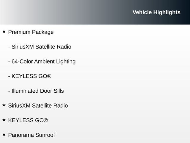 64-Color Ambient Lighting, Illuminated Door Sills, KEYLESS GO®, Panorama Sunroof, Premium Package, SiriusXM Satellite Radio.