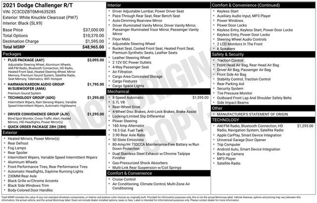 1-Yr SiriusXM Guardian Trial, 18 Speakers Premium Audio System, 230MM Rear Axle, 276 Watt Amplifier, 3.90 Rear Axle Ratio, 4-Wheel Disc Brakes, 4G LTE Wi-Fi Hot Spot, 6 Speakers, 8.4 Touchscreen Display, ABS brakes, Air Conditioning, Alloy wheels, AM/FM radio, Anti-whiplash front head restraints, Apple CarPlay, Apple CarPlay/Android Auto, Auto High Beam Headlamp Control, Auto-dimming Rear-View mirror, Automatic temperature control, Black-Edged Premium Floormats, Brake assist, Bumpers: body-color, Compass, Delay-off headlights, Dodge Performance Pages, Door Trim Panel w/Ambient Lighting, Driver Convenience Group, Driver door bin, Driver vanity mirror, Dual front impact airbags, Dual front side impact airbags, Electronic Stability Control, For Details, Visit DriveUconnect.com, For More Info, Call 800-643-2112, Four wheel independent suspension, Front anti-roll bar, Front Bucket Seats, Front Center Armrest, Front dual zone A/C, Front fog lights, Front reading lights, Fully automatic headlights, Garage door transmitter, Google Android Auto, GPS Antenna Input, GPS Navigation, harman/kardon Audio Group w/Subwoofer, harman/kardon GreenEdge Amp, Heated door mirrors, Houndstooth Cloth Performance Seats, Illuminated entry, Integrated Center Stack Radio, Integrated Voice Command w/Bluetooth®, Leather Shift Knob, Line Lock, Low tire pressure warning, Media Hub (2 USB, AUX), Outside temperature display, Overhead airbag, Overhead console, Panic alarm, ParkView Rear Back-Up Camera, Passenger door bin, Passenger vanity mirror, Plus Package, Power door mirrors, Power driver seat, Power Multi-Function Foldaway Mirrors, Power steering, Power Tilt/Telescope Steering Column, Power windows, Premium-Stitched Dash Panel, Quick Order Package 28H, Radio data system, Radio: Uconnect 4 w/7 Display, Radio: Uconnect 4C Nav w/8.4 Display, Radio: Uconnect 4C w/8.4 Display, Rear anti-roll bar, Rear reading lights, Rear seat center armrest, Rear window defroster, Remote keyless entry, Security system, Shark Fin Antenna, SiriusXM Satellite Radio, Speed control, Speed-sensing steering, Split folding rear seat, Spoiler, Sport steering wheel, Steering wheel mounted audio controls, Surround Sound, Tachometer, Technology Group, Telescoping steering wheel, Tilt steering wheel, Traction control, Trip computer, USB Host Flip, Variably intermittent wipers, Wheels: 20 x 8 Machined w/Granite Pocket, Wheels: 20 x 8 Satin Carbon Aluminum.