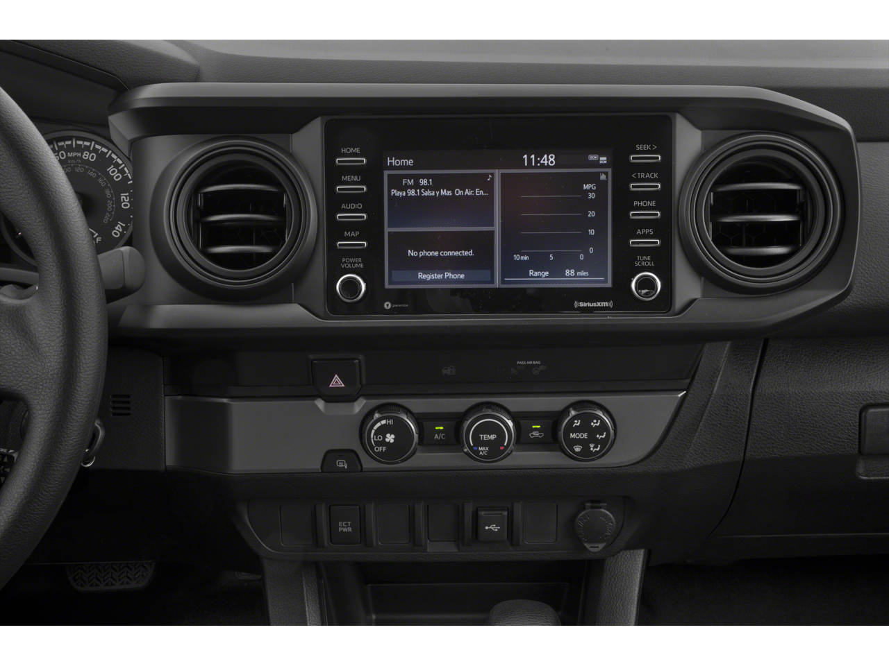 ABS brakes, Air Conditioning, AM/FM radio: SiriusXM, Anti-whiplash front head restraints, Apple CarPlay/Android Auto, Auto High-beam Headlights, Automatic temperature control, Brake assist, Bumpers: body-color, Driver door bin, Dual front impact airbags, Dual front side impact airbags, Electronic Stability Control, Emergency communication system: Safety Connect with 1-year trial, Front anti-roll bar, Front Bucket Seats, Front Center Armrest, Front dual zone A/C, Front reading lights, Front wheel independent suspension, Illuminated entry, Knee airbag, Low tire pressure warning, Occupant sensing airbag, Outside temperature display, Overhead airbag, Overhead console, Passenger door bin, Power door mirrors, Power steering, Power windows, Rear step bumper, Speed control, Speed-sensing steering, Split folding rear seat, Steering wheel mounted audio controls, Tachometer, Telescoping steering wheel, Tilt steering wheel, Traction control, Variably intermittent wipers.