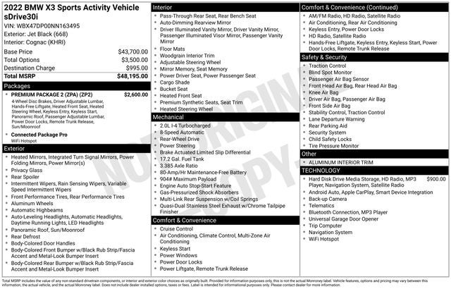 CARFAX One-Owner. Clean CARFAX. Jet Black 2022 BMW X3 sDrive30i RWD 8-Speed Automatic Sport 2.0L I4 TwinPower Turbo 12 Speakers, 3.385 Axle Ratio, 4-Wheel Disc Brakes, ABS brakes, Air Conditioning, Alloy wheels, Aluminum Interior Trim, AM/FM Radio, AM/FM radio: SiriusXM with 360L, Apple CarPlay & Android Auto Compatibility, Auto High-beam Headlights, Auto-dimming door mirrors, Auto-dimming Rear-View mirror, Automatic temperature control, BMW Assist eCall, BMW TeleServices, Brake assist, Bumpers: body-color, Comfort Access Keyless Entry, Connected Package Pro, ConnectedDrive Services, Delay-off headlights, Driver door bin, Driver vanity mirror, Dual front impact airbags, Dual front side impact airbags, Electronic Stability Control, Emergency communication system: BMW Assist eCall, Enhanced Bluetooth®, Exterior Parking Camera Rear, Four wheel independent suspension, Front anti-roll bar, Front Bucket Seats, Front Center Armrest, Front dual zone A/C, Front reading lights, Fully automatic headlights, Garage door transmitter, Genuine wood dashboard insert, Genuine wood door panel insert, Gesture Control, Heated door mirrors, Heated Front Seats, Heated Steering Wheel, Hi-Fi Sound System, Illuminated entry, Knee airbag, Live Cockpit Pro w/Navigation, Low tire pressure warning, Lumbar Support, Memory seat, Navigation, Navigation System, Occupant sensing airbag, Outside temperature display, Overhead airbag, Panic alarm, Panoramic Moonroof (ZPA), Passenger door bin, Passenger vanity mirror, Perforated SensaTec Upholstery, Power door mirrors, Power driver seat, Power Front Seats, Power Liftgate, Power passenger seat, Power steering, Power windows, Premium Package 2 (ZPA), Radio data system, Rain sensing wipers, Rear air conditioning, Rear anti-roll bar, Rear reading lights, Rear seat center armrest, Rear window defroster, Rear window wiper, Reinforced Brakes, Remote keyless entry, Roof rack: rails only, Security system, SiriusXM w/360L, Speed control, Speed-sensing steering, Speed-Sensitive Wipers, Split folding rear seat, Spoiler, Sport Seats, Sport steering wheel, Steering wheel mounted audio controls, Tachometer, Telescoping steering wheel, Tilt steering wheel, Traction control, Trip computer, Turn signal indicator mirrors, Variably intermittent wipers, Wheels: 19 x 7.5 Y-Spoke (Style 693), WiFi Hotspot.