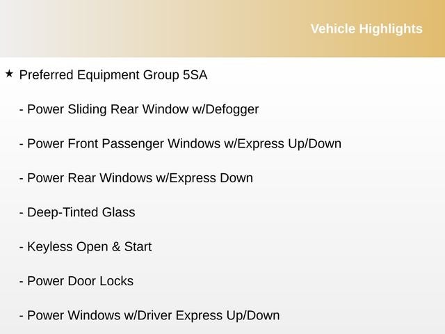 - Navigation System, Steering Wheel Audio Controls, Electric Rear-Window Defogger, Power Windows, Remote Vehicle Starter, Keyless Open & Start, Lane Departure Warning, Automatic Emergency Braking, HD Surround Vision, Wireless Charging, Heated & Ventilated Front Seats