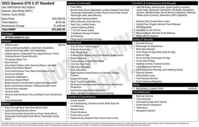 - Radio: AM/FM/SiriusXM/HD Audio System -inc: 6 speakers including subwoofer, 6 channel internal amplifier, speed-sensing auto volume control, 5th generation navigation system w/10.25" touchscreen, dynamic voice recognition, connected routing, over the air updates, Android Auto and Apple CarPlay, Bluetooth® hands-free phone system, steering wheel audio, cruise and phone controls, USB front and Genesis Connected Services