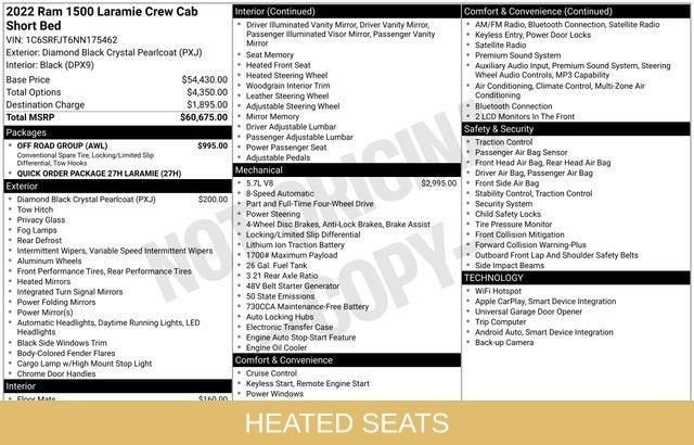 The off-road capabilities of this truck are equally impressive, thanks to the Off-Road Group package that includes features like extra heavy-duty shock absorbers, an e-locker rear axle, hill descent control, and more. Whether you're tackling rugged terrain or navigating city streets, the 2022 Ram 1500 Laramie is up for the challenge.