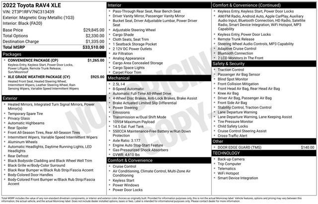 Clean CARFAX. Magnetic Gray Metallic 2022 Toyota RAV4 XLE 2.5L 4-Cylinder DOHC Dual VVT-i 8-Speed Automatic AWD4-Wheel Disc Brakes, 6 Speakers, ABS brakes, Air Conditioning, Alloy wheels, AM/FM radio: SiriusXM, AM/FM Stereo, Apple CarPlay/Android Auto, Auto High-beam Headlights, Automatic temperature control, Axle Ratio: 3.177, Brake assist, Bumpers: body-color, Delay-off headlights, Driver door bin, Driver vanity mirror, Dual front impact airbags, Dual front side impact airbags, Electronic Stability Control, Emergency communication system: Safety Connect with 1-year trial, Exterior Parking Camera Rear, Fabric Seat Trim, Four wheel independent suspension, Front anti-roll bar, Front Bucket Seats, Front Center Armrest, Front dual zone A/C, Front reading lights, Fully automatic headlights, Heated door mirrors, Illuminated entry, Knee airbag, Low tire pressure warning, Occupant sensing airbag, Outside temperature display, Overhead airbag, Overhead console, Panic alarm, Passenger door bin, Passenger vanity mirror, Power door mirrors, Power driver seat, Power steering, Power windows, Radio data system, Rear anti-roll bar, Rear seat center armrest, Rear window defroster, Rear window wiper, Remote keyless entry, Roof rack: rails only, Speed control, Speed-sensing steering, Split folding rear seat, Spoiler, Steering wheel mounted audio controls, Tachometer, Telescoping steering wheel, Tilt steering wheel, Traction control, Trip computer, Turn signal indicator mirrors, Variably intermittent wipers, Wheels: 17 5-Spoke Silver Alloy.