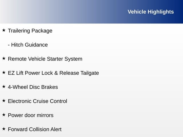 - Custom Convenience Package includes (BTV) Remote Start with (UTJ) content theft alarm, (C49) rear-window defogger, (UF2) bed LED cargo area lighting and (QT5) EZ Lift power lock and release tailgate (Included and only available with (PDX) Custom Value Package.)