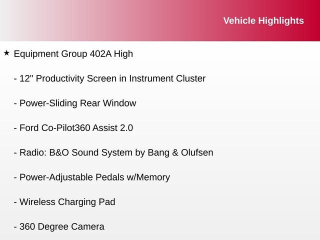 12 Productivity Screen in Instrument Cluster, 2nd Row Heated Seats, 360 Degree Camera, ABS brakes, Advanced Security Pack, Alloy wheels, Compass, Electronic Stability Control, Equipment Group 402A High, Ford Co-Pilot360 Assist 2.0, Front dual zone A/C, Heated door mirrors, HEATED FRONT SEATS, Heated Steering Wheel, Illuminated entry, LED Projector w/Dynamic Bending Headlamps, Low tire pressure warning, Power Glass Sideview Mirr w/Body-Color Skull Caps, Power Tilt/Telescoping Steering Column w/Memory, Power-Adjustable Pedals w/Memory, Power-Sliding Rear Window, Pro Trailer Backup Assist & Pro Trailer Hitch Assist, Radio: B&O Sound System by Bang & Olufsen, Rain-Sensing Wipers, Remote keyless entry, Traction control, Twin Panel Moonroof, Unique Tremor Leather-Trimmed Bucket Seats, Universal Garage Door Opener, Wireless Charging Pad.