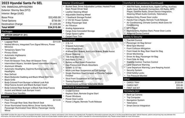 The Santa Fe's striking exterior is complemented by a spacious and well-appointed interior, offering a premium driving experience. With its 2.5L I4 engine and 8-Speed Automatic with SHIFTRONIC transmission, this SUV delivers an exceptional balance of power and efficiency, achieving an impressive 25 city and 28 highway MPG.