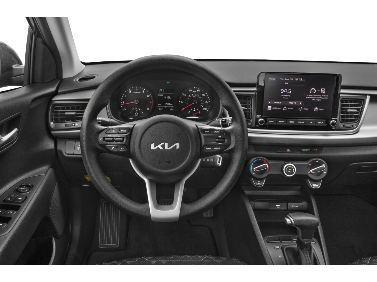 Step inside the 2023 Kia Rio S and discover a cabin that prioritizes your comfort and convenience. The spacious interior, with its Woven & Tricot Cloth Seat Trim, Front Center Armrest, and Split Folding Rear Seat, offers ample room for you and your passengers to enjoy the ride. The intuitive layout of the dashboard, complete with an Overhead Console and Tachometer, ensures you stay informed and in control behind the wheel.