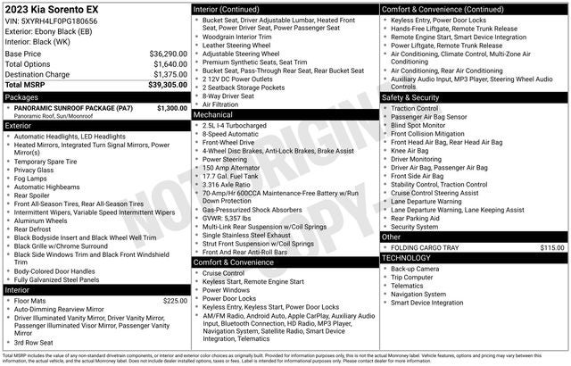 Clean CARFAX. Ebony Black 2023 Kia Sorento EX FWD 8-Speed DCT 2.5L I4 DGI Turbocharged DOHC 16V LEV3-ULEV70 281hp 3.316 Axle Ratio, 3rd row seats: split-bench, 4-Wheel Disc Brakes, 6 Speakers, ABS brakes, Air Conditioning, Alloy wheels, AM/FM radio: SiriusXM, Apple CarPlay & Android Auto, Auto High-beam Headlights, Auto-dimming Rear-View mirror, Automatic temperature control, Brake assist, Bumpers: body-color, Carpet Floor Mats, Delay-off headlights, Driver door bin, Driver vanity mirror, Dual front impact airbags, Dual front side impact airbags, Electronic Stability Control, Emergency communication system, Exterior Parking Camera Rear, Folding Cargo Tray, Four wheel independent suspension, Front anti-roll bar, Front Bucket Seats, Front Center Armrest, Front dual zone A/C, Front fog lights, Front reading lights, Fully automatic headlights, Heated door mirrors, Heated Front Bucket Seats, Heated front seats, Illuminated entry, Knee airbag, Leather Shift Knob, Leather steering wheel, LED Interior Lighting, Low tire pressure warning, Navigation System, Occupant sensing airbag, Outside temperature display, Overhead airbag, Overhead console, Panic alarm, Panoramic Power Sunroof w/Power Sunshade, Panoramic Sunroof Package, Passenger door bin, Passenger vanity mirror, Power door mirrors, Power driver seat, Power Liftgate, Power passenger seat, Power steering, Power windows, Radio data system, Radio: AM/FM Audio System, Rear air conditioning, Rear anti-roll bar, Rear reading lights, Rear window defroster, Rear window wiper, Remote keyless entry, Roof rack: rails only, Security system, Smart Key w/ Push Button and Remote Start, Speed control, Speed-sensing steering, Split folding rear seat, Spoiler, Steering wheel mounted audio controls, SynTex Artificial Leather Seat Trim, Tachometer, Telescoping steering wheel, Tilt steering wheel, Traction control, Trip computer, Turn signal indicator mirrors, Variably intermittent wipers, Wheels: 7.5J x 18 Machine-Finished Alloy.