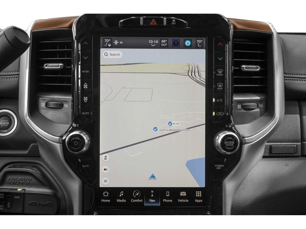 10 Speakers, 115V Auxiliary Rear Power Outlet, 12 Touchscreen Display, 17 Speaker harman/kardon Premium Sound, 2 Way Rear Headrest Seat, 4 Adjustable Cargo Tie-Down Hooks, 4 Way Front Headrests, 4-Wheel Disc Brakes, 4G LTE Wi-Fi Hot Spot, ABS brakes, Active Noise Control System, Adaptive Cruise Control w/Stop, Adaptive Steering System, Air Conditioning, Alexa Built-In, Alloy wheels, AM/FM radio: SiriusXM with 360L, Anti-Spin Differential Rear Axle, Apple CarPlay, Apple CarPlay/Android Auto, Auto Adjust In Reverse Exterior Mirrors, Auto Dim Exterior Mirror, Auto High Beam Headlamp Control, Auto Level Rear Air Suspension, Auto Power-Folding Mirrors, Auto-Dimming Exterior Passenger Mirror, Auto-dimming Rear-View mirror, Automatic temperature control, Bed Utility Group, Black Interior Accents, Blind Spot & Cross Path Detection, Body Color Grille Surround, Brake assist, Bumpers: body-color, Center Hub, Center Stop Lamp w/Cargo View Camera, Chrome Exterior Mirrors, Clearance Lamps, Compass, Connected Travel & Traffic Services, Connectivity - US/Canada, Dash Pass Thru Wire Circuits, Delay-off headlights, Disassociated Touchscreen Display, Driver door bin, Driver vanity mirror, Dual front impact airbags, Dual front side impact airbags, Electronic Stability Control, Electronically Controlled Throttle, Exterior Mirrors Courtesy Lamps, Exterior Mirrors w/Heating Element, Exterior Mirrors w/Memory, Exterior Mirrors w/Supplemental Signals, Foam Bottle Insert (Door Trim Panel), For Details, Visit DriveUconnect.com, For More Info, Call 800-643-2112, Forward & Reverse Utility Lights, Front anti-roll bar, Front Center Armrest w/Storage, Front dual zone A/C, Front LED Fog Lamps, Front reading lights, Front Seat Back Map Pockets, Full Speed Forward Collision Warning Plus, Fully automatic headlights, Garage door transmitter, Global Telematics Box Module (TBM), Google Android Auto, GPS Antenna Input, GPS Navigation, HD Radio, Heated door mirrors, Heated Front Seats, Heated front seats, Heated Second Row Seats, Heated Steering Wheel, Heated steering wheel, High Back Seats, I/P Mounted Auxiliary Switches, Illuminated entry, Integrated Voice Command w/Bluetooth®, Lane Keep Assist, Laramie Level F Equipment Group, Leather steering wheel, Leather Trim 40/20/40 Bench Seat, LED Bed Lighting, LED Reflector Headlamps, Low tire pressure warning, Mirror Power Heat Fold Memory Tele, Mirror Running Lights, MOPAR Deployable Bed Step, MOPAR Spray In Bedliner, Navigation System, Occupant sensing airbag, Off-Road Information Pages, Outside temperature display, Overhead airbag, Overhead console, Panic alarm, ParkSense Front/Rear Park Assist System, ParkView Rear Back-Up Camera, Passenger door bin, Passenger vanity mirror, Power 2-Way Driver Lumbar Adjust, Power 2-Way Passenger Lumbar Adjust, Power Adjust 8-Way Driver Seat, Power Adjust 8-Way Front Passenger Seat, Power Adjust Mirrors, Power Adjustable Convex Aux Mirrors, Power Adjustable Pedals w/Memory, Power door mirrors, Power driver seat, Power passenger seat, Power steering, Power Telescoping Mirrors, Power windows, Protection Group, Quick Order Package 2GH Laramie, Radio data system, Radio: Uconnect 5 Nav w/12.0 Display, Radio: Uconnect 5 Nav w/8.4 Display, Radio/Driver Seat/Mirrors/Pedals Memory, Rain Sensitive Windshield Wipers, RamBox Cargo Management System, Rear 60/40 Folding Seat, Rear anti-roll bar, Rear Power Sliding Window, Rear reading lights, Rear seat center armrest, Rear step bumper, Rear Window Defroster, Remote keyless entry, Remote Tailgate Release, Safety Group, Security system, Selectable Tire Fill Alert, SiriusXM Radio Service, SiriusXM w/360L, Speed control, Split folding rear seat, Sport Appearance Package, Sport Decal, Sport Performance Hood, Steering wheel mounted audio controls, Surround View Camera System, Tachom