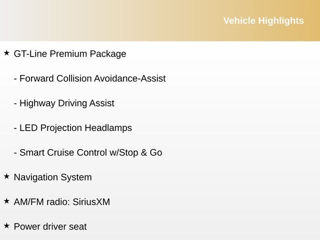 • GT-LINE PREMIUM PACKAGE: Includes Smart Cruise Control w/Stop & Go, LED Projection Headlamps, Highway Driving Assist, Forward Collision Avoidance-Assist, cyclist and junction turning