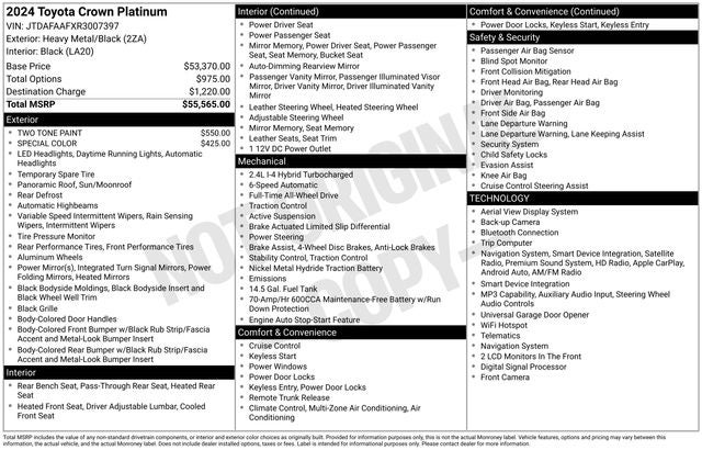Under the hood, the Crown Platinum's 2.4L 4-Cylinder engine, paired with a 6-Speed Automatic transmission and All-Wheel Drive, delivers a thrilling driving experience with an impressive 29 city / 32 highway MPG.
