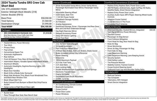Midnight Black Metallic 2024 Toyota Tundra SR5 4WD 10-Speed Automatic 3.4L V6 4WD, Gray Cloth, 32 Gallon Fuel Tank, Blind Spot Monitor w/Lane Change Assist, Parking Support Alert/Brake, SR5 Convenience Package.