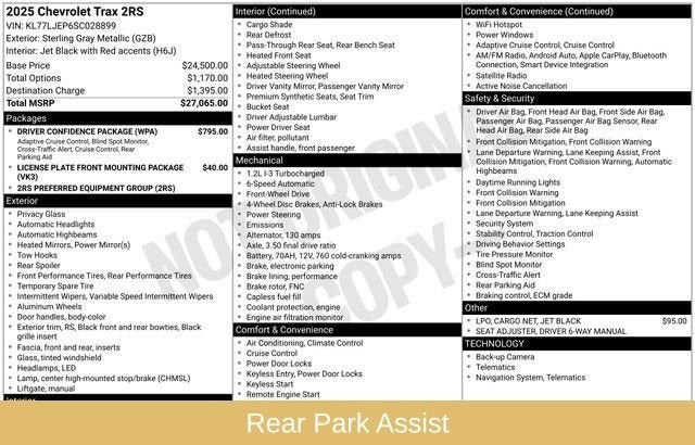 The Trax 2RS also boasts a host of advanced safety features, including Rear Park Assist, Rear Cross-Traffic Alert, and Lane Change Alert with Side Blind Zone Alert, ensuring your peace of mind on the road. The Driver Confidence Package further enhances your driving experience with Adaptive Cruise Control, providing a seamless and stress-free commute.