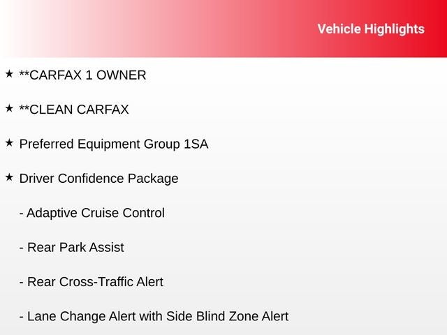 - Driver Confidence Package (Rear Park Assist, Rear Cross Traffic Alert, Lane Change Alert with Side Blind Zone Alert, Adaptive Cruise Control)
