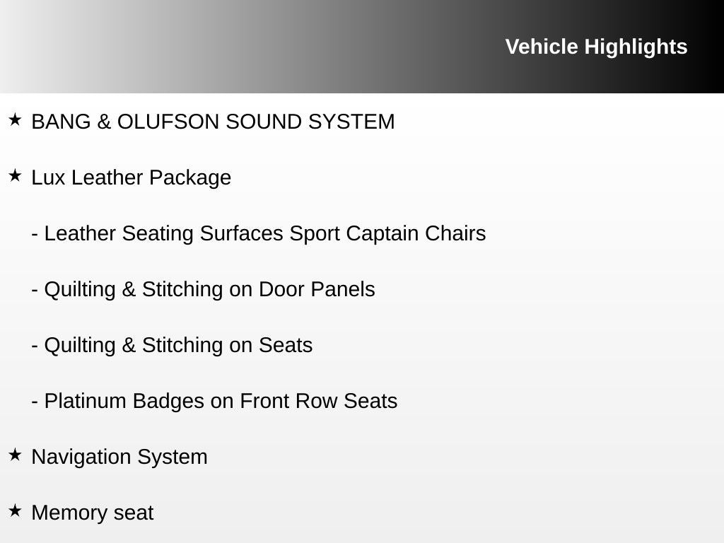 BANG & OLUFSON SOUND SYSTEM, 4WD, Apple CarPlay/Android Auto, Exterior Parking Camera Rear, Heated front seats, Heated rear seats, Leather Seating Surfaces Sport Captain Chairs, Lux Leather Package, Memory seat, Navigation System, Platinum Badges on Front Row Seats, Power Liftgate, Power moonroof, Quilting & Stitching on Door Panels, Quilting & Stitching on Seats, Rain sensing wipers, Ventilated front seats, Wheels: 21 Bright Machined Alum w/Tarnish Dk Pkts.