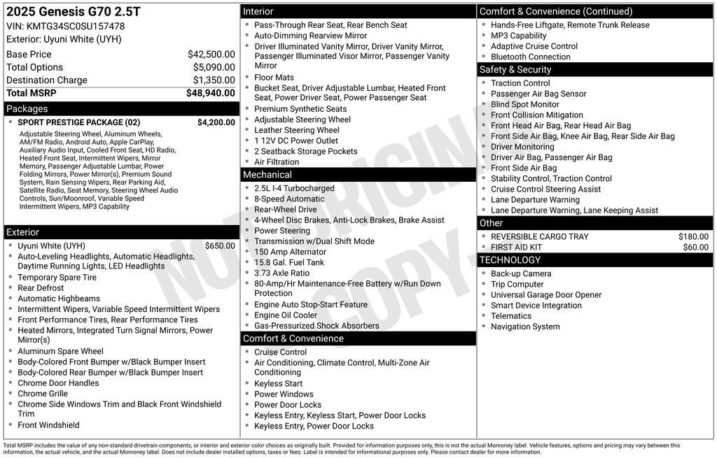 - Radio: AM/FM/SiriusXM/HD Audio System -inc: 6 speakers, 5th generation navigation system w/10.25" touchscreen, dynamic voice recognition, connected routing, over the air updates, Android Auto and Apple CarPlay, SiriusXM Radio w/90-day trial subscription (not available in Alaska or Hawaii), Genesis connected services, Bluetooth® hands-free phone and audio streaming system