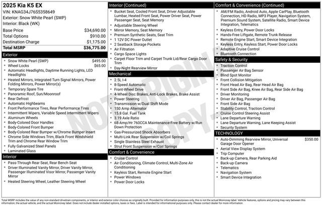 Under the hood, the K5 EX is powered by a reliable and efficient I4 engine, paired with an 8-speed automatic transmission and front-wheel drive. With an impressive EPA-estimated 25 city/36 highway MPG, this sedan delivers exceptional fuel economy, allowing you to go further on every tank.