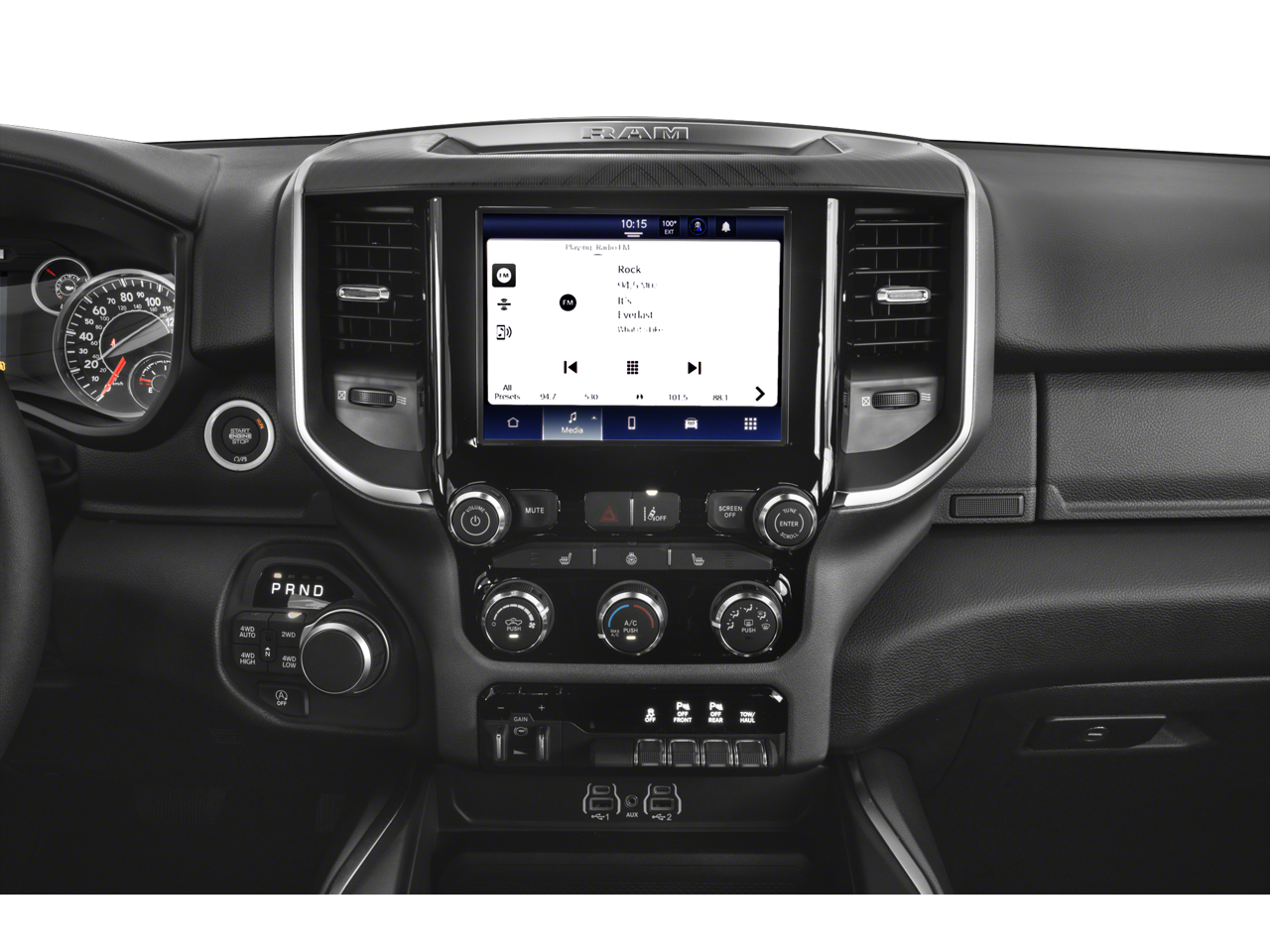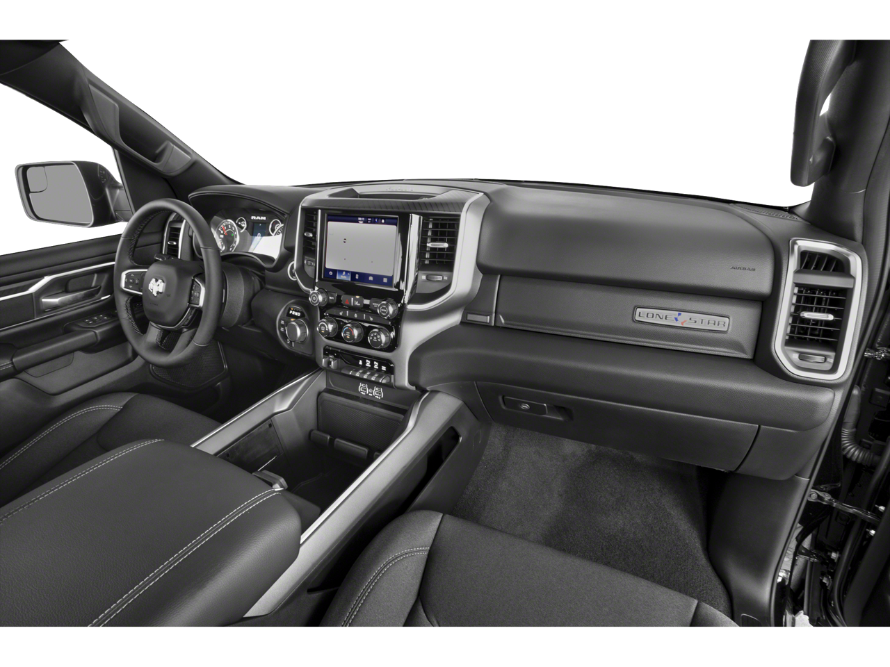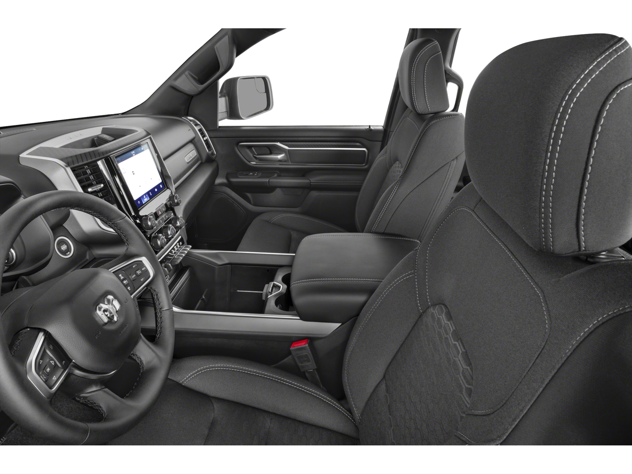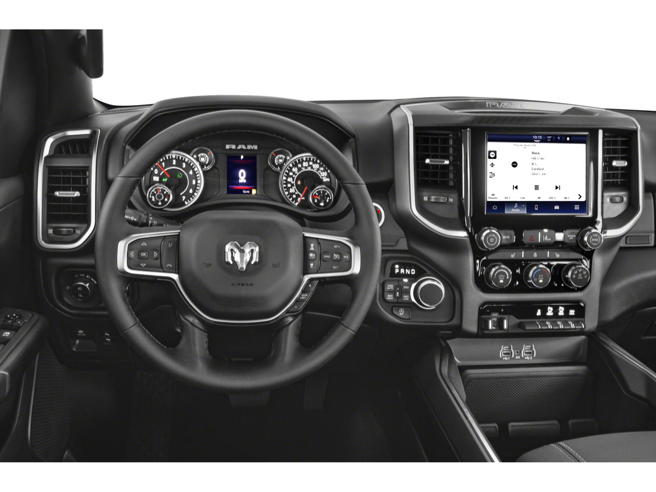 115V Auxiliary Power Outlet, 115V Auxiliary Rear Power Outlet, 12 Touchscreen Display, 2nd Row In Floor Storage Bins, 3 Rear Seat Head Restraints, 4 Way Front Headrests, 4-Wheel Disc Brakes, 400W Inverter, 4G LTE Wi-Fi Hot Spot, 6 Speakers, 9 Amplified Speakers w/Subwoofer, ABS brakes, Accent Color Door Handles, Accent Color Premium Power Mirrors, Accent Color Tailgate Handle, Air Conditioning, Air Conditioning ATC w/Dual Zone Control, Alloy wheels, AM/FM radio, Anti-Spin Differential Rear Axle, Apple CarPlay, Apple CarPlay/Android Auto, Auto High-beam Headlights, Auto Power-Folding Mirrors, Auto-Dimming Exterior Driver Mirror, Auto-Dimming Rear-View Mirror, Bed Utility Group, Big Horn Level 2 Equipment Group, Black Exterior Mirrors, Black Exterior Truck Badging, Black Headlamp Bezels, Black Interior Accents, Black Painted Exterior Mirrors Caps, Black Premium Power Mirrors, Black Tail Lamp Bezels, Body Color Front Bumper, Body Color Rear Bumper w/Step Pads, Brake assist, Bucket Seats, Bumpers: chrome, Cloth Bench Seat, Cluster 12 TFT Color Display, Cluster 7.0 TFT Color Display, Compass, Configurable Drive Mode, Connected Travel & Traffic Services, Connectivity - US/Canada, Convex Wide-Angle Exterior Mirror Insert, Delay-off headlights, Deluxe Cloth Bucket Seats, Driver door bin, Dual front impact airbags, Dual front side impact airbags, Electronic Stability Control, Exterior 115V AC Outlet, Exterior Mirrors Courtesy Lamps, Exterior Mirrors w/Heating Element, Exterior Mirrors w/Supplemental Signals, Front anti-roll bar, Front Center Armrest w/Storage, Front fog lights, Front reading lights, Front Seat Back Map Pockets, Front wheel independent suspension, Full Length Floor Console, Fully automatic headlights, Glove Box Lamp, Google Android Auto, GPS Antenna Input, GPS Navigation, Grille Black Surround Black Mesh, HD Radio, Heated door mirrors, Heated Front Seats, Heated Steering Wheel, Illuminated entry, Integrated Voice Command w/Bluetooth®, Leather Wrapped Steering Wheel, LED Dome Lamp w/On/Off Switch, LED Footwell Lighting, Low tire pressure warning, Manual Adjust 4-Way Front Passenger Seat, Manual Folding Exterior Mirrors, Media Hub w/2 Charge Only USBs, MOPAR 4 Adjustable Cargo Tie-Down Hooks, MOPAR Front & Rear Rubber Floor Mats, MOPAR Spray In Bedliner, Night Edition, Occupant sensing airbag, Outside temperature display, Overhead airbag, Overhead console, Overhead LED Lamps, Panic alarm, ParkView Rear Back-Up Camera, Passenger door bin, Passenger vanity mirror, Pick-Up Box Lighting, Power 2-Way Driver Lumbar Adjust, Power Adjust 8-Way Driver Seat, Power Adjustable Pedals, Power door mirrors, Power steering, Power windows, Premium Overhead Console, Quick Order Package 21Z Big Horn, Radio data system, Radio: Uconnect 5 Nav w/12.0 Display, Radio: Uconnect 5 W w/8.4 Display, RAM Grille Badge - Black, RAM Grille Badge - Chrome, Rear 60/40 Folding Seat, Rear anti-roll bar, Rear Center Armrest, Rear Power Sliding Window, Rear seat center armrest, Rear step bumper, Rear Window Defroster, Remote keyless entry, Remote Tailgate Release, Security Alarm, SiriusXM w/360L, Speed control, Split folding rear seat, Steering Wheel Mounted Audio Controls, Sun Visors w/Illuminated Vanity Mirrors, Supplier Part Tracking (J-1), Tachometer, Telescoping steering wheel, Tilt steering wheel, Traction control, Trip computer, Universal Garage Door Opener, USB Host Flip, Variably intermittent wipers, Voltmeter, Wheels: 18 x 8 Cast-Aluminum Painted, Wheels: 20 x 9.0 Aluminum Painted Clad.