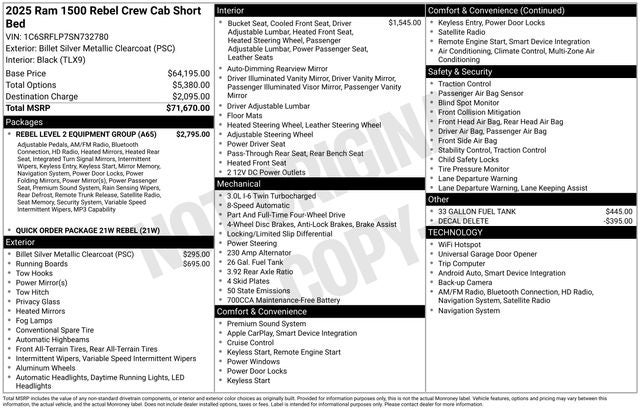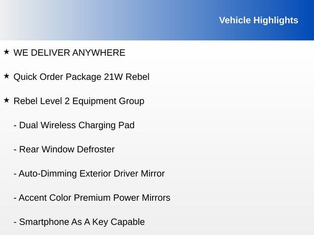 Billet Silver Metallic Clearcoat 2025 Ram 1500 Rebel 4WD 8-Speed Automatic 3.0L I6 WE DELIVER ANYWHERE, 115V Auxiliary Rear Power Outlet, 2-Door Passive Entry, Front Door Locks, 4G LTE Wi-Fi Hot Spot, Accent Color Door Handles, Accent Color Premium Power Mirrors, Accent Color Tailgate Handle, Apple CarPlay, Auto Power-Folding Mirrors, Auto-Dimming Exterior Driver Mirror, Black Painted Exterior Mirrors Caps, Connected Travel & Traffic Services, Connectivity - US/Canada, Convex Wide-Angle Exterior Mirror Insert, Driver Seat Memory, Dual Wireless Charging Pad, Exterior Mirrors Approach Lamps, Exterior Mirrors Courtesy Lamps, Exterior Mirrors w/Heating Element, Exterior Mirrors w/Memory, Exterior Mirrors w/Supplemental Signals, Front Passenger Interactive Display, Google Android Auto, GPS Antenna Input, GPS Navigation, harman/kardon 19 Speaker Premium Sound, HD Radio, Heated Second Row Seats, Integrated Voice Command w/Bluetooth®, Media Hub w/2 Charge Only USBs, Off-Road Information Pages, Power Adjust 8-Way Front Passenger Seat, Power Adjustable Pedals w/Memory, Power Tailgate, Proximity Approach/Departure Lamps, Quick Order Package 21W Rebel, Radio: Uconnect 5 Nav w/14.4 Display, Radio/Driver Seat/Mirrors/Pedals Memory, Rain Sensitive Windshield Wipers, Rear Window Defroster, Rebel Level 2 Equipment Group, Security Alarm, SiriusXM w/360L, Smartphone As A Key Capable, USB Host Flip, 10 Speakers, 3.92 Rear Axle Ratio, 33 Gallon Fuel Tank, 4 Way Front Headrests, 4-Wheel Disc Brakes, ABS brakes, Air Conditioning, Alloy wheels, AM/FM radio: SiriusXM with 360L, Apple CarPlay/Android Auto, Auto High-beam Headlights, Auto-dimming Rear-View mirror, Automatic temperature control, Brake assist, Bucket Seats, Cloth/Vinyl Bucket Seats, Compass, Delay-off headlights, Driver door bin, Driver vanity mirror, Dual front impact airbags, Dual front side impact airbags, Electronic Stability Control, Front anti-roll bar, Front Bucket Seats, Front Center Armrest w/Storage, Front dual zone A/C, Front fog lights, Front reading lights, Front Seat Back Map Pockets, Front wheel independent suspension, Full Length Upgraded Floor Console, Fully automatic headlights, Garage door transmitter, Heated door mirrors, Heated front seats, Heated steering wheel, Illuminated entry, Leather steering wheel, Low tire pressure warning, Manual Folding Exterior Mirrors, Mopar Black Tubular Side Steps, Navigation System, Occupant sensing airbag, Outside temperature display, Overhead airbag, Overhead console, Panic alarm, ParkView Rear Back-Up Camera, Passenger door bin, Passenger vanity mirror, Power Adjust 8-Way Driver Seat, Power door mirrors, Power driver seat, Power steering, Power windows, Radio data system, Radio: Uconnect 5 Nav w/12.0 Display, Rear 60/40 Folding Seat, Rear anti-roll bar, Rear seat center armrest, Rear step bumper, Remote keyless entry, Speed control, Split folding rear seat, Steering wheel mounted audio controls, Tachometer, Telescoping steering wheel, Tilt steering wheel, Traction control, Trip computer, Variably intermittent wipers, Voltmeter, Wheels: 18 x 8.0 Painted Mid-Gloss Black, 115V Auxiliary Rear Power Outlet, 2-Door Passive Entry, Front Door Locks, 4G LTE Wi-Fi Hot Spot, Accent Color Door Handles, Accent Color Premium Power Mirrors, Accent Color Tailgate Handle, Apple CarPlay, Auto Power-Folding Mirrors, Auto-Dimming Exterior Driver Mirror, Black Painted Exterior Mirrors Caps, Connected Travel & Traffic Services, Connectivity - US/Canada, Convex Wide-Angle Exterior Mirror Insert, Driver Seat Memory, Dual Wireless Charging Pad, Exterior Mirrors Approach Lamps, Exterior Mirrors Courtesy Lamps, Exterior Mirrors w/Heating Element, Exterior Mirrors w/Memory, Exterior Mirrors w/Supplemental Signals, Front Passenger Interactive Display, Google Android Auto, GPS Antenna Input, GPS Navigation, harman/kardon 19 Speaker Premium Sound, HD Radio, Heated Second Row Seats, Integrated Voice Command w/Bluet