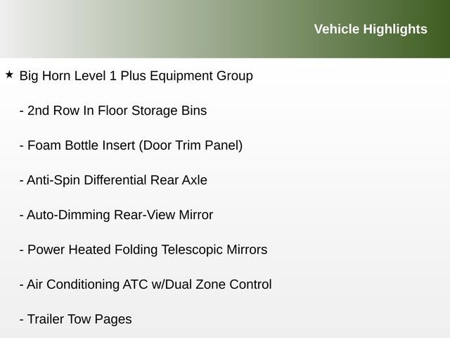 12 Touchscreen Display, 2nd Row In Floor Storage Bins, 4G LTE Wi-Fi Hot Spot, 9 Alpine Speakers w/Subwoofer, Air Conditioning ATC w/Dual Zone Control, Alexa Built-In, Anti-Spin Differential Rear Axle, Apple CarPlay, Auto Power-Folding Mirrors, Auto-Dimming Rear-View Mirror, Big Horn Level 1 Plus Equipment Group, Black Exterior Mirrors, Cold Weather Group, Connected Travel & Traffic Services, Connectivity - US/Canada, Dual Glove Boxes, Emergency Vehicle Alert System (EVAS), Engine Block Heater, Exterior Mirrors Courtesy Lamps, Exterior Mirrors w/Heating Element, Exterior Mirrors w/Supplemental Signals, Foam Bottle Insert (Door Trim Panel), Footwell Courtesy Lamp, Forward & Reverse Utility Lights, Front Performance Tuned Shock Absorbers, Global Telematics Box Module (TBM), Glove Box Lamp, Google Android Auto, GPS Antenna Input, GPS Navigation, HD Radio, Hill Assist-AVEC, Integrated Voice Command w/Bluetooth®, LED Bed Lighting, Locking Lower Glove Box, Luxury Steering Wheel, Mirror Running Lights, MOPAR Deployable Bed Step, MOPAR Spray In Bedliner, MOPAR Winter Front Grille Cover, Off Road Package, Off-Road Info Pages, Power Adjust Mirrors, Power Adjustable Convex Aux Mirrors, Power Heated Folding Telescopic Mirrors, Power Telescoping Mirrors, Premium Cloth 40/20/40 Bench Seat, Radio: Uconnect 5 Nav w/12.0 Display, Rear Dome w/On/Off Switch Lamp, Rear Performance Tuned Shock Absorbers, Remote Start System, Selectable Tire Fill Alert, SiriusXM Radio Service, SiriusXM w/360L, Steering Wheel Mounted Audio Controls, Trailer Tow Pages.