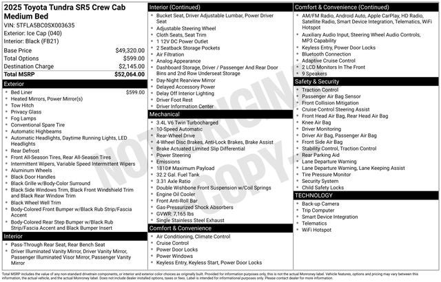 Equipped with a suite of advanced features, the Tundra SR5 offers unparalleled comfort and convenience. Enjoy the convenience of automatic temperature control, power windows, and remote keyless entry, all while staying connected with the intuitive infotainment system and 9-speaker audio setup.